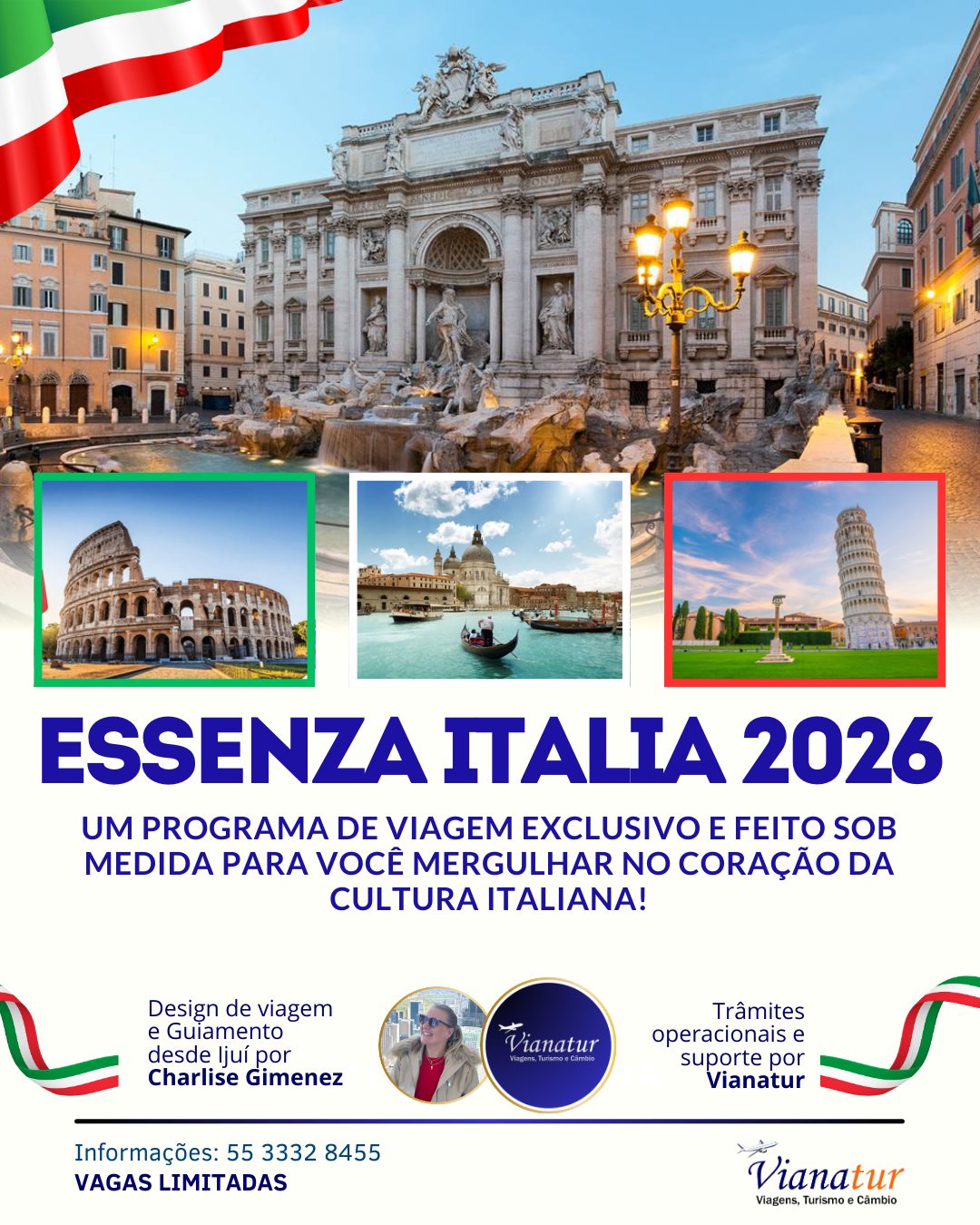 Uma Jornada Exclusiva de Descobertas e Sabores com Guiamento Presencial desde Ijuí e um Roteiro Personalizado! Apresentamos: ESSENZA ITALIA 2026, um programa de viagem exclusivo e feito sob medida para você mergulhar no coração da cultura italiana! Prepare-se para uma jornada de descobertas por cidades icônicas como Milão, Veneza, Florença, Roma e Nápoles, onde cada … Ler mais
